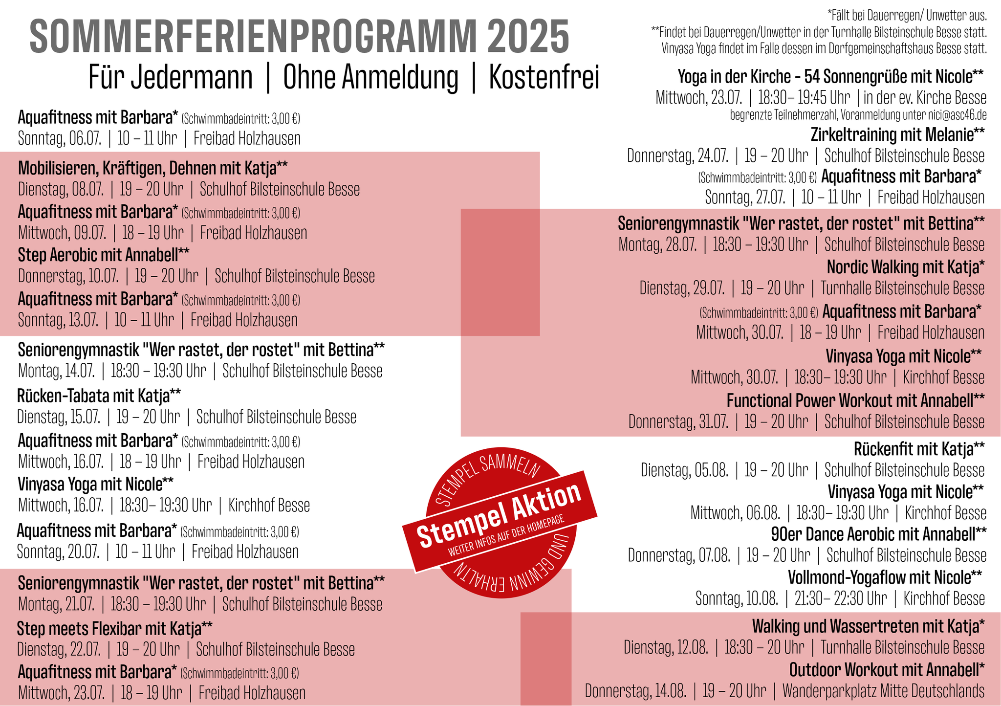 Jedes Jahr in den Sommerferien pausiert das reguläre Sportprogramm. Stattdessen laden wir jeden kostenfrei und ohne Anmeldung zu unserem außerordentlichen Sommerfreienprogramm ein, bei welchem ihr sämtliche Sportangebote im besten Fall bei Sonnenschein unter freiem Himmel ausprobieren könnt.